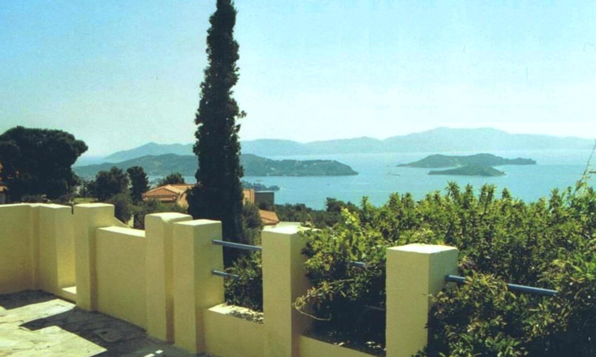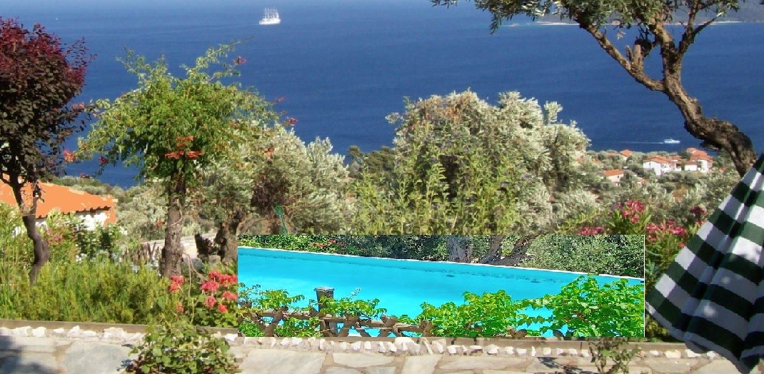 ... nestles in a half-acre hillside olive-grove, amongst a few villas attractively scattered along the Skiathos best coastal viewpoint - the Katsaros ridge overlooking sandy beaches below, and the stunning '7-island' 60-mile panoramic view across Skiathos bay to Skopelos, Evia, and Skyros islands. It's only 10 mins drive to Skiathos village and harbours, with tavernas, cafes, bars, and shops - and 10-25 mins to most of the 60+ mainly sandy beaches. More details, click here: "About Skiathos", and for how to get here, Travel to Skiathos ... (briefly - the extended Skiathos Airport brought fares down for direct daily UK and European charters, or budget flights to Athens and onward by local flights or express hydrofoil. It's also surprisingly quick and practical as a car tour (under 17 hours drive from Calais, via Venice ferry).