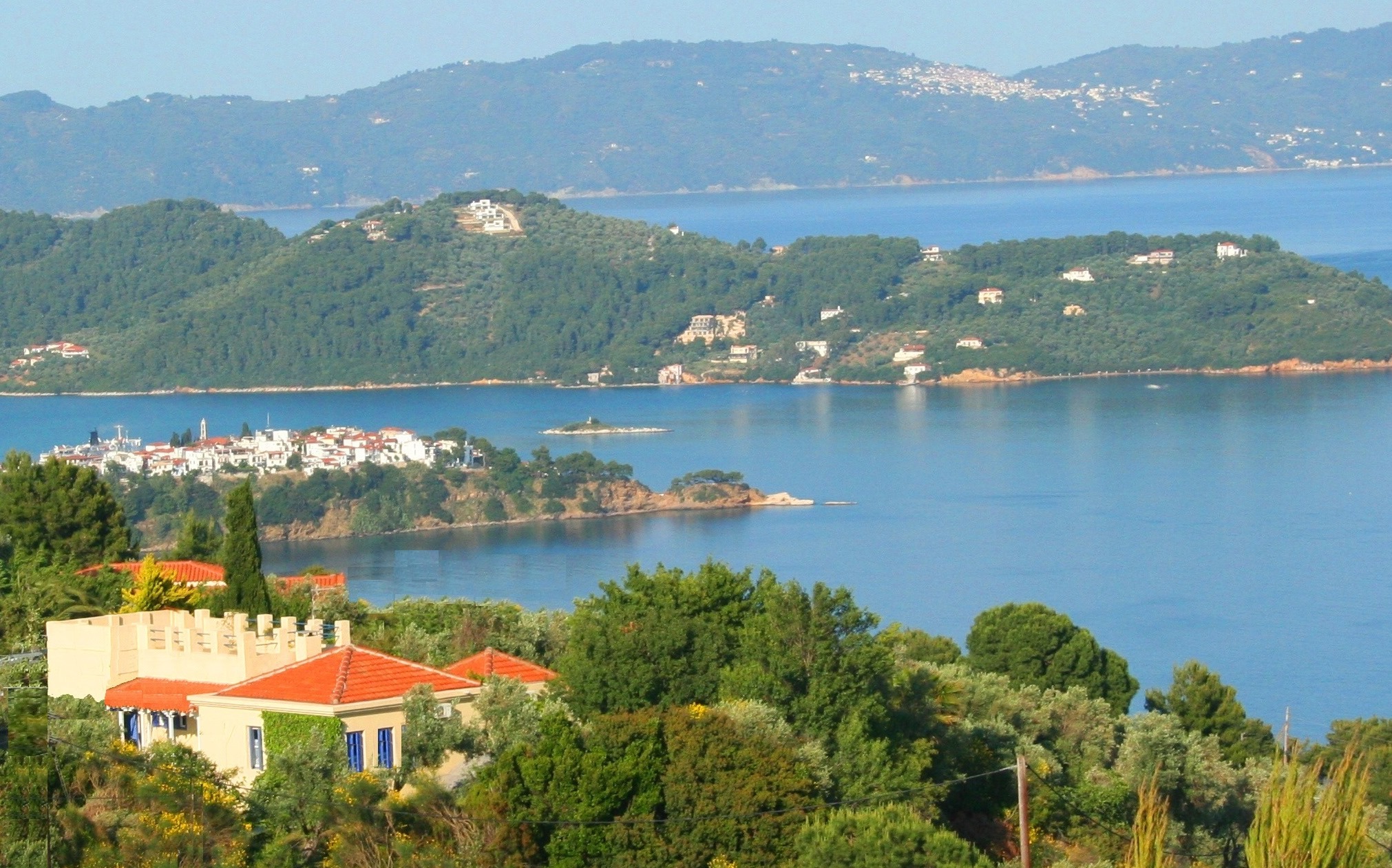 Orchard Villa on ridge, from Kanapitsa beach - Sklithri beach below, Skiathos village to r.