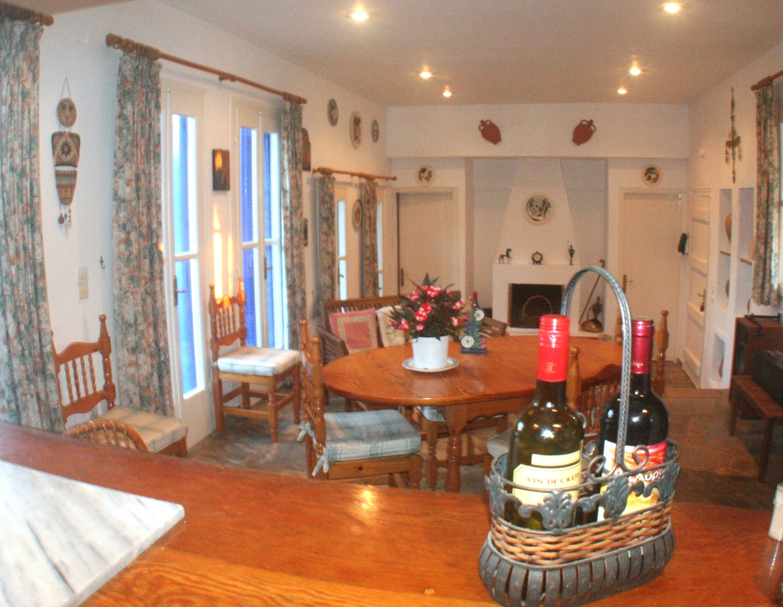 DINING - inside, and on the courtyardpatio The split-level living room is open-plan to the well-equipped kitchen, and doors by the traditional fireplace (winter only!) to two guest wings with four air-conditioned bedrooms. There’s a wine rack, cook-book library, and lots of paperbacks for that rare rainy day. Four French windows open onto a tastefully furnished vine-covered split-level courtyard patio overlooking a half-acre hillside olive-grove garden, with three terraces for sunbathing, partying, and drinks on the lower terrace (above the pool). You enjoy unmatched views over Skiathos bay and channel to the '7-islands' view (nine if you look carefully!), and over sixty mostly sandy beaches or hidden coves. The villa courtyard patio with tasteful wood furniture (not the usual white plastic!) is your extended living-room, sheltered from breezes and warm enough for dinner and drinks 'til after midnight; with the garden lights and moonlit sea views across to the diamond necklace of village lights on Skopelos and Evia Islands.
