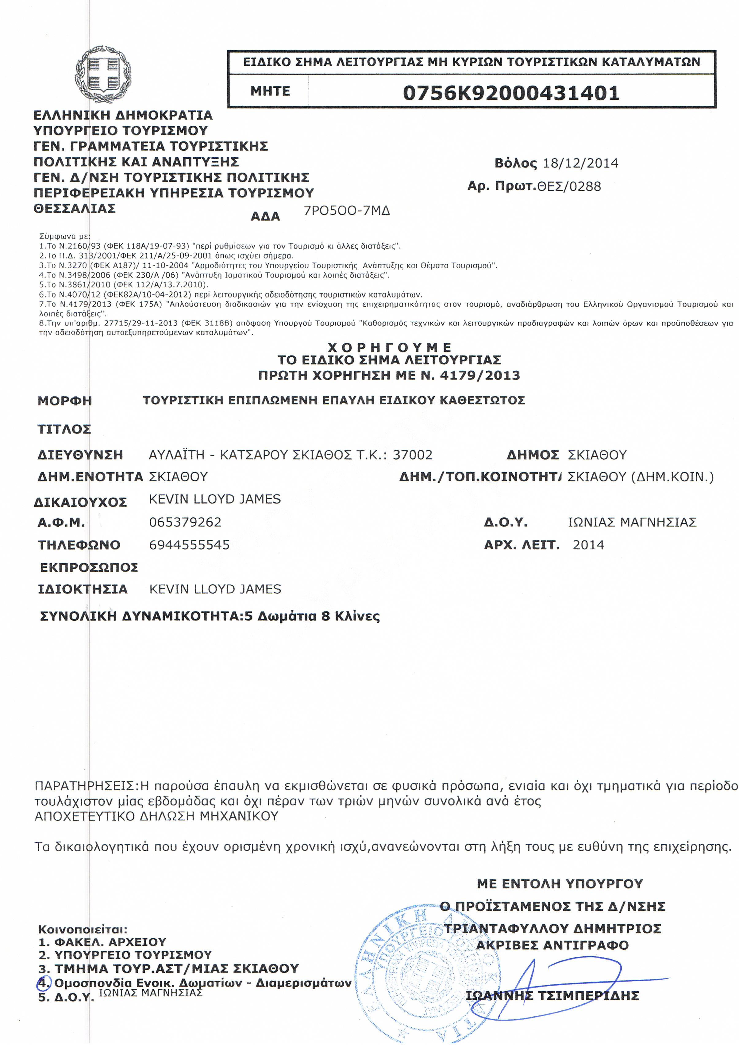 CERTIFICATION Orchard Villa was listed on the former 'Owner’s Direct' site since 2005 (and 'Sunday Times', 1992). It is certified by the Greek Tourist Authority (see menu-tab 'Photos') to be short-leased on the regulatory/legal basis of landlord to tenant (not as hotel or lodgings to a guest).
