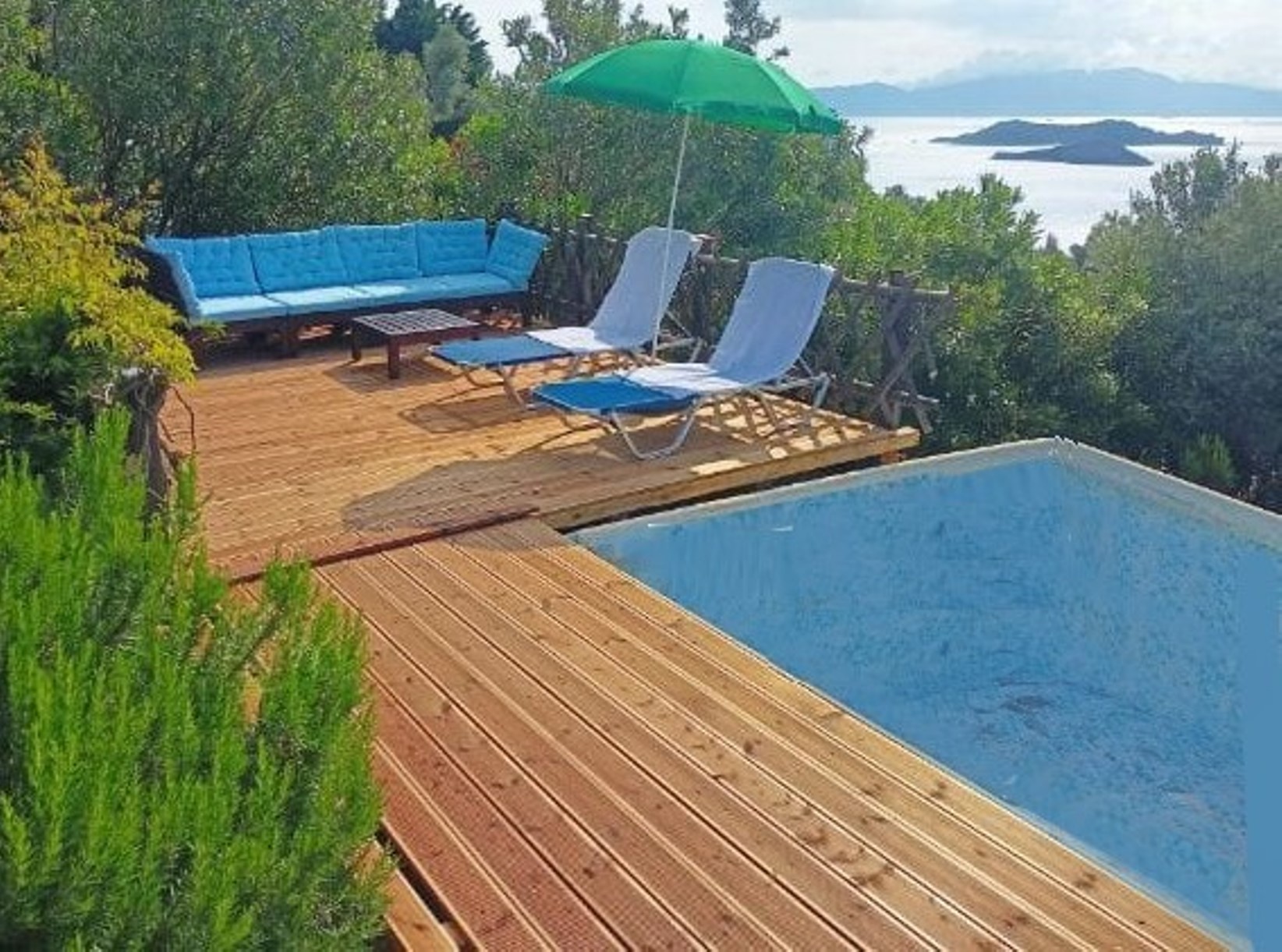 The ‘above-ground’ Pool and wood decking is attractively set in-ground on a ledge cut into the hillside, with access a couple of steps down from the lower terrace. At 7½ x 4m. it’s like most Skiathos mid-size villas' pools, but more for kids than adults as it's just a child-safe 1¼m. deep!