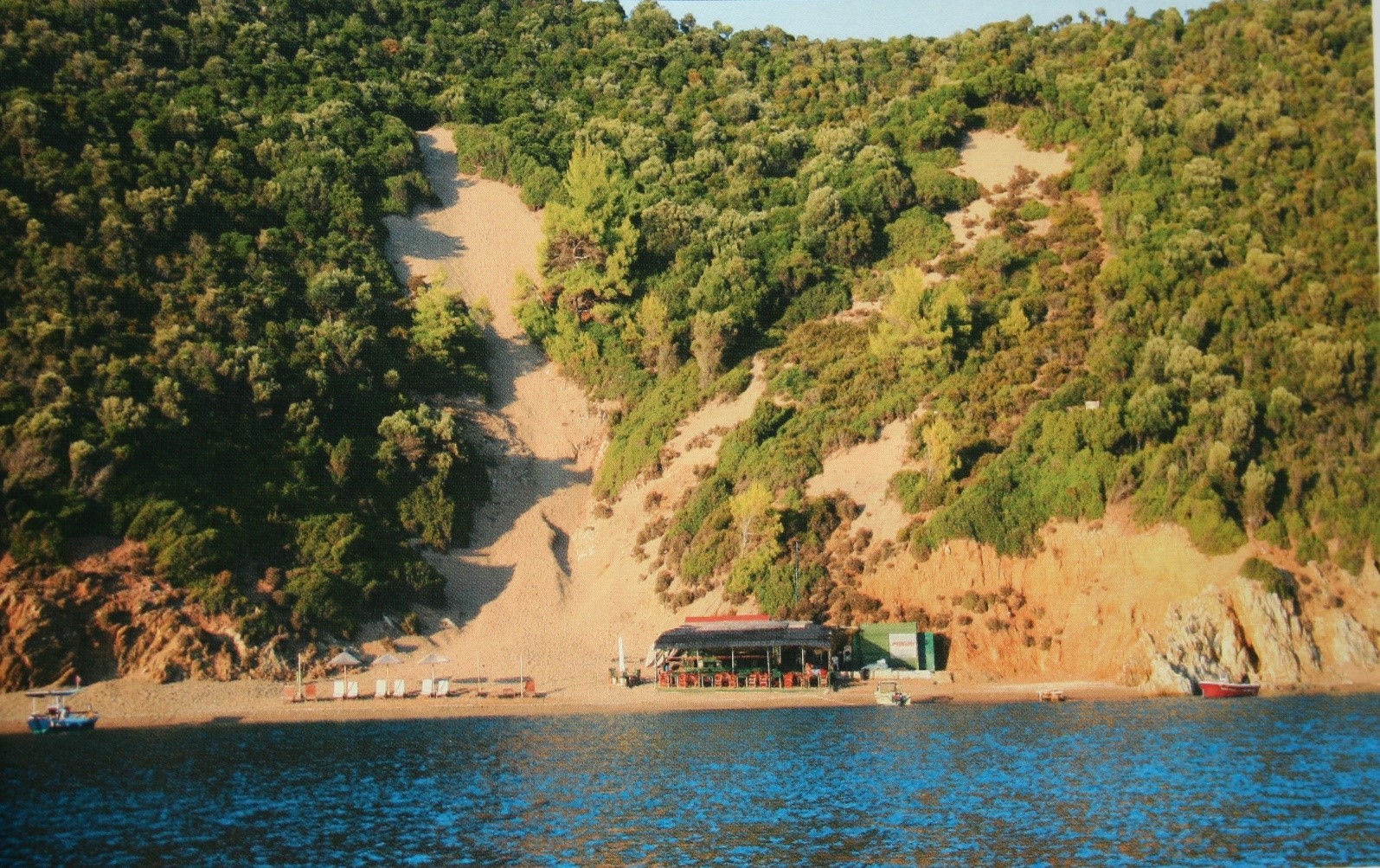 At blue sign ‘Sklithri Taverna’ two main-road bends before the turn-off to Kanapitsa (§21.1), park in field on the R. (sign, “Free Parking”), and cross the road to broad steps down to beach and taverna (beware traffic zooming at you round blind bends both ways!). The beach and taverna - open-air, tree-shaded, board- and sand-floored - are still old-time Greece; no organised umbrellas/ loungers, no water-sports, and two steps across the sand into the sea. It’s a favourite with 'yachties' moored in the bay.