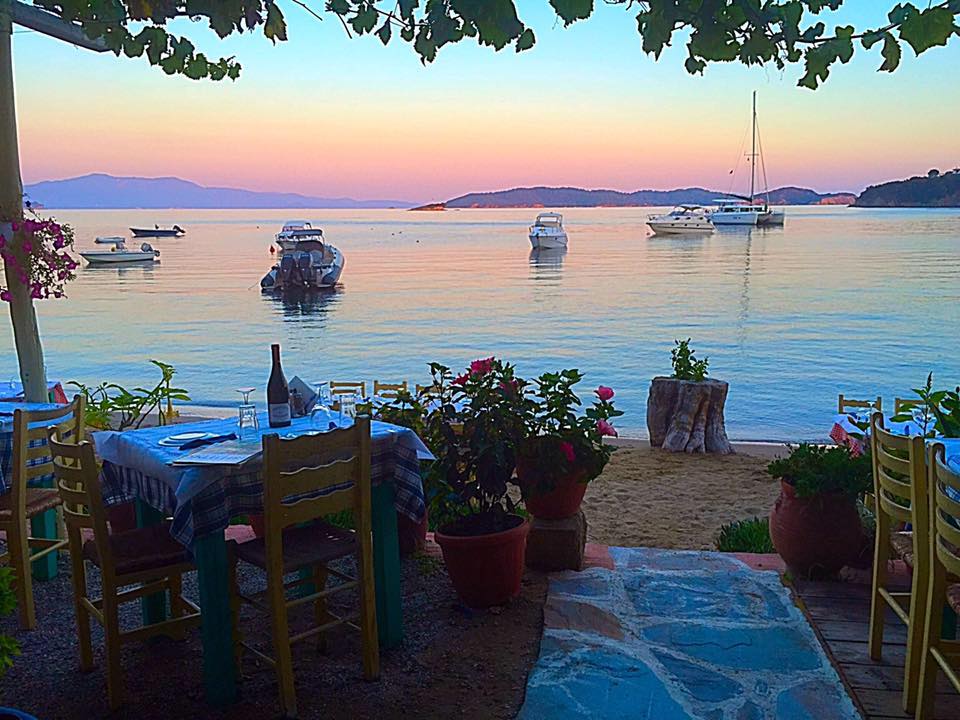 - Tip... beach-side tavernas and bars are totally happy for you to “set up camp” at a table as base for going off swimming, boating, etc. - provided you “pay the rent” with drinks, and if you’re there across lunchtime proper - say 12.30-2:30 - take a meal of course. (Skopelos is a bit more laid-back; recall once trying to order lunch on the paralia at 1 o'clock, only to be told "What, now? - we're still on breakfast" !)