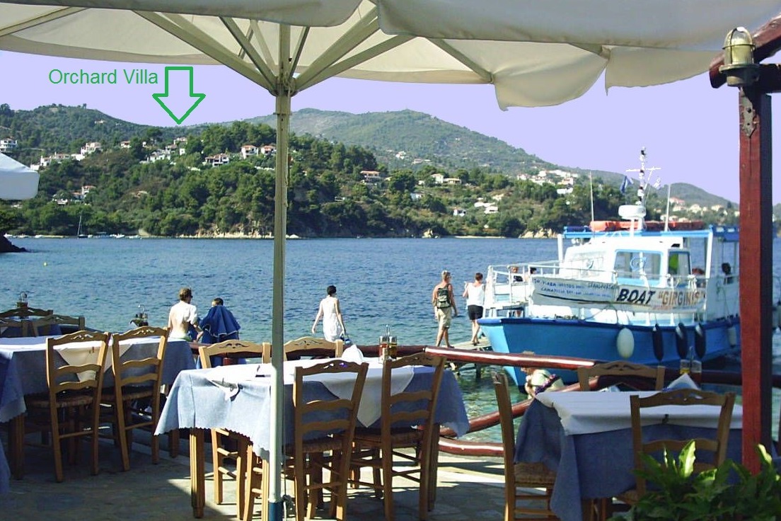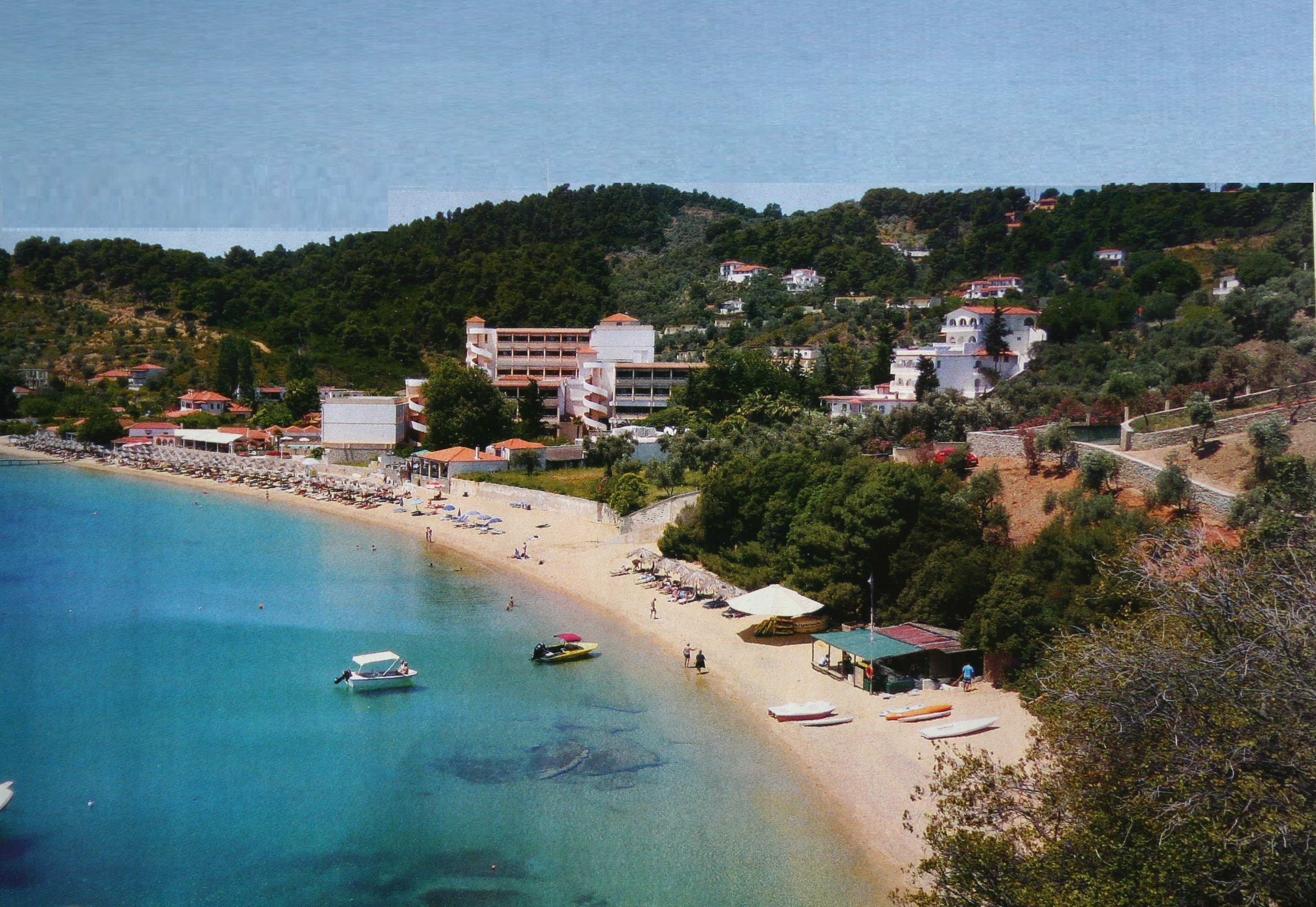- Main beaches (all sandy) are those you overlook from the villa terraces and pool, along the south-east coast. The closest are (at r.) 'Vassilias' ('King’s', also now called 'Randa') and 'Achladies' ('Pear-tree', both at 5-8 mins drive or 15-20 mins walk down the hill from the Villa (but check seriously before committing yourself to having to walk back up - see §2.2 below). All other beaches are within 5-25 mins drive (plus maybe a short walk or scramble down), or by water-taxi caïque from Skiathos harbour. The dozen or so main beaches (including Vassilias/Achladies) have one or more tavernas and bars, and water-sports such as water skiing; parascending; inflatable rings and 'rockets' towed by speed-boats; dinghy sailing; canoes or pedalos; windsurfing.
