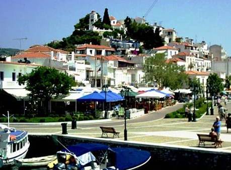 Skiathos - Ag Nikolaos from Bourtzi isle over tavernas on old port