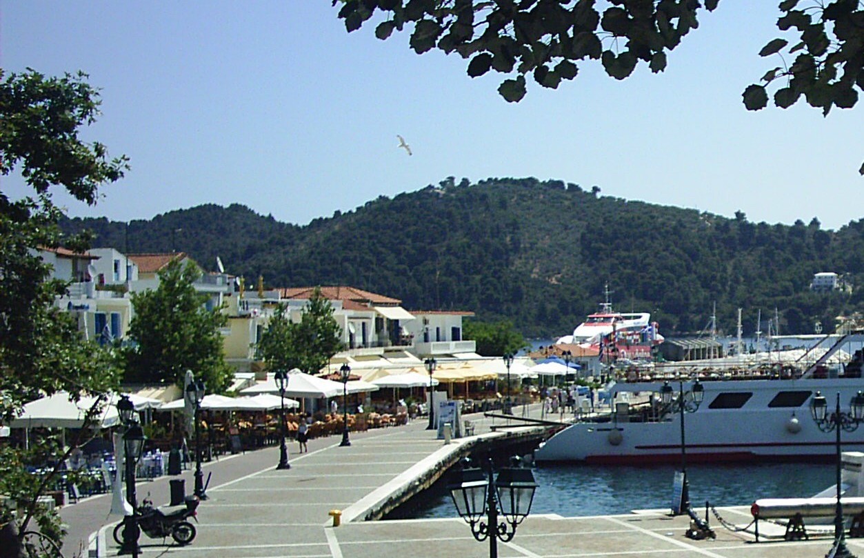 Skiathos old port tavernas - from iconic 'Chicken George' grill on 'The Steps'
